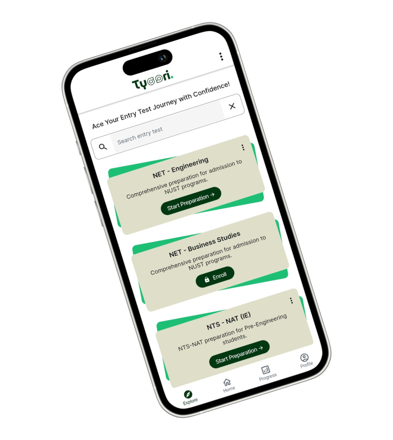 Everything is designed around actual entry-test patterns like MDCAT, ECAT, NET, FAST-NU, and more.